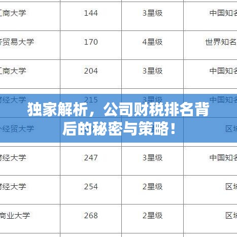 在当今竞争激烈的市场环境下,公司财税排名成为了衡量企业综合实力的重要标准之一,财税排名不仅反映了公司在行业内的经济地位,更是企业运营状况、盈利能力以及管理效率的综合体现,本文将详细探讨公司财税排名的背后含义、影响因素以及如何提升排名,以期为企业决策者提供有价值的参考。